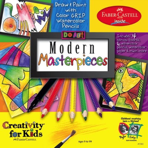 A Faber-Castell Creativity For Kids Kit. Learn how to draw, color, and paint in the style of modern masters including: Picasso, Kandinsky, Mondrian, and Warhol. Experiment on watercolor paper and canvas boards using Faber-Castell Grip Watercolor pencils, paintbrush, and an outline pen. Display your creations on the included mounting boards. This kit contains 6 GRIP watercolor eco pencils, 4 black